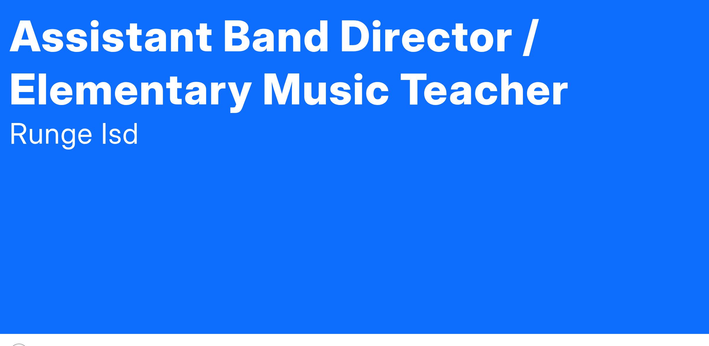 Runge ISD is seeking a dynamic, collaborative, and student-centered educator to serve as the Assistant Band Director and Elementary Music Teacher. This dual-role position supports our thriving high school band program—currently the district’s largest student organization—and provides foundational music instruction to elementary students in grades PK–5. The ideal candidate is passionate about music education across developmental levels, committed to high-quality instruction, and eager to contribute to a culture of excellence and school pride.