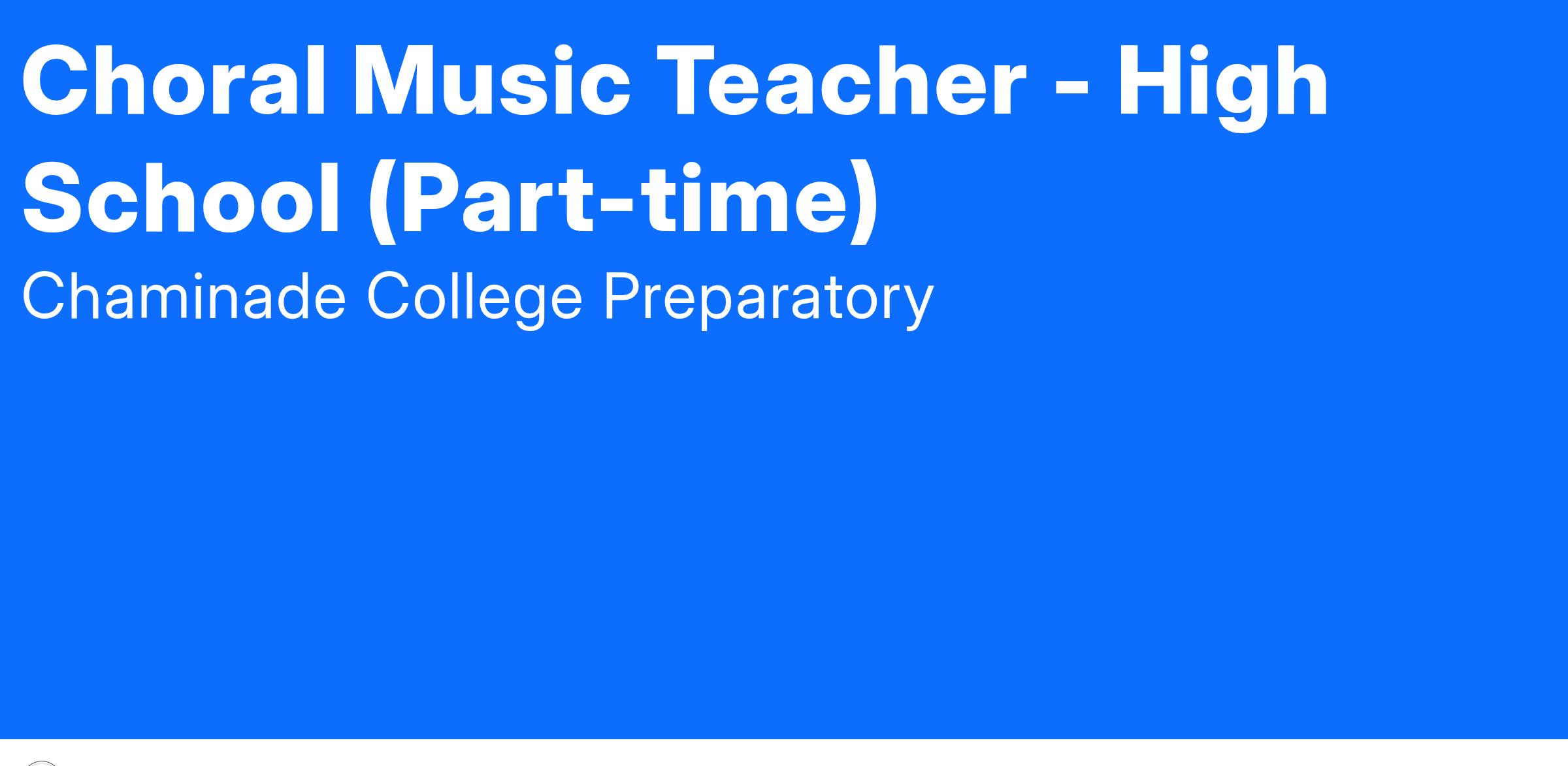 Chaminade College Preparatory seeks a dynamic, innovative, and engaging CHORAL MUSIC TEACHER with great classroom management skills for our high school campus in West Hills, California. The Choral Music Teacher is responsible for classroom choral music instruction and for directing all choral performing groups and ensembles. This is a part-time position.