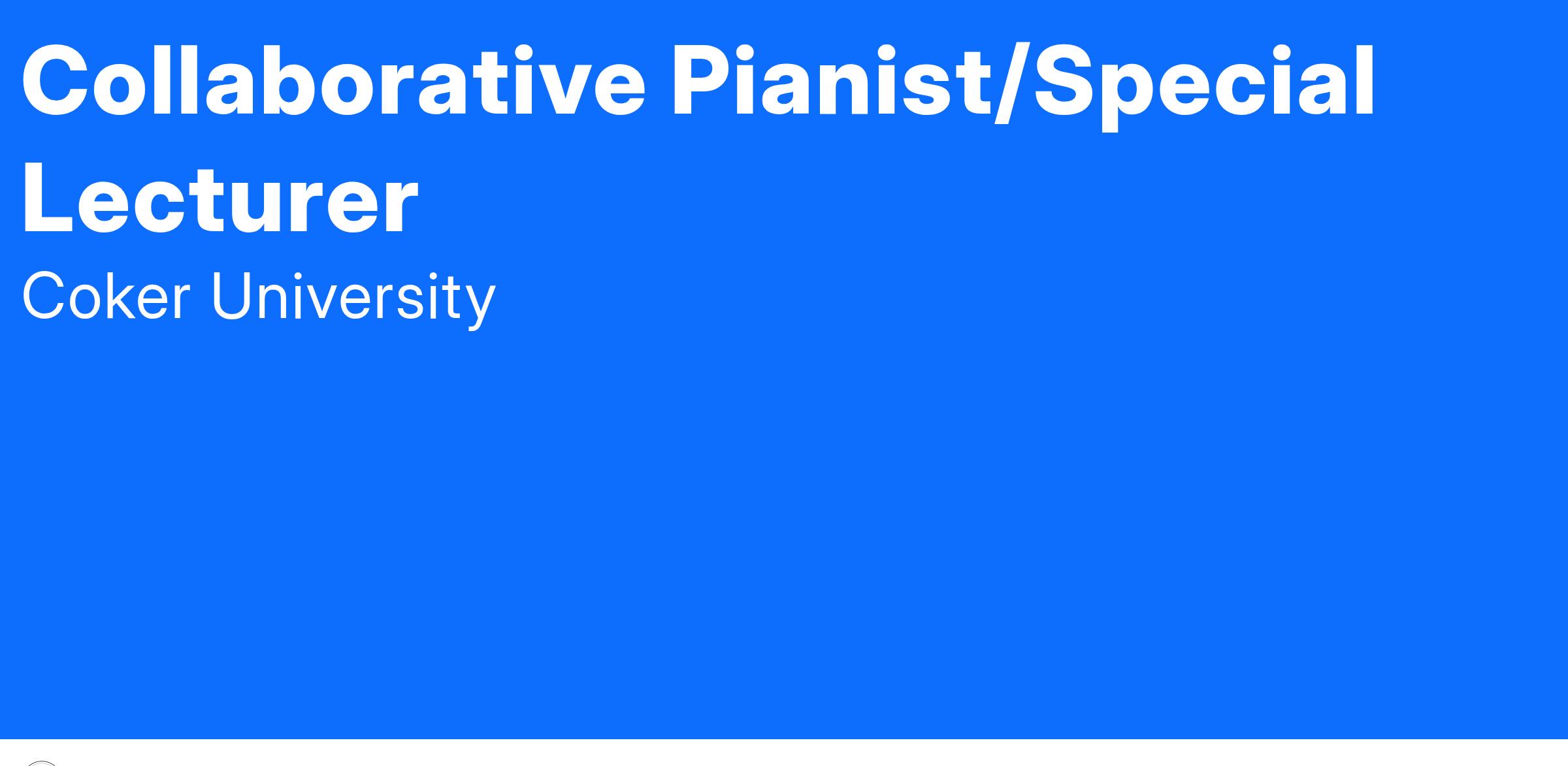 Special Lecturer of Collaborative Piano and Music Theory, McCall School of Visual and Performing Arts, Coker University