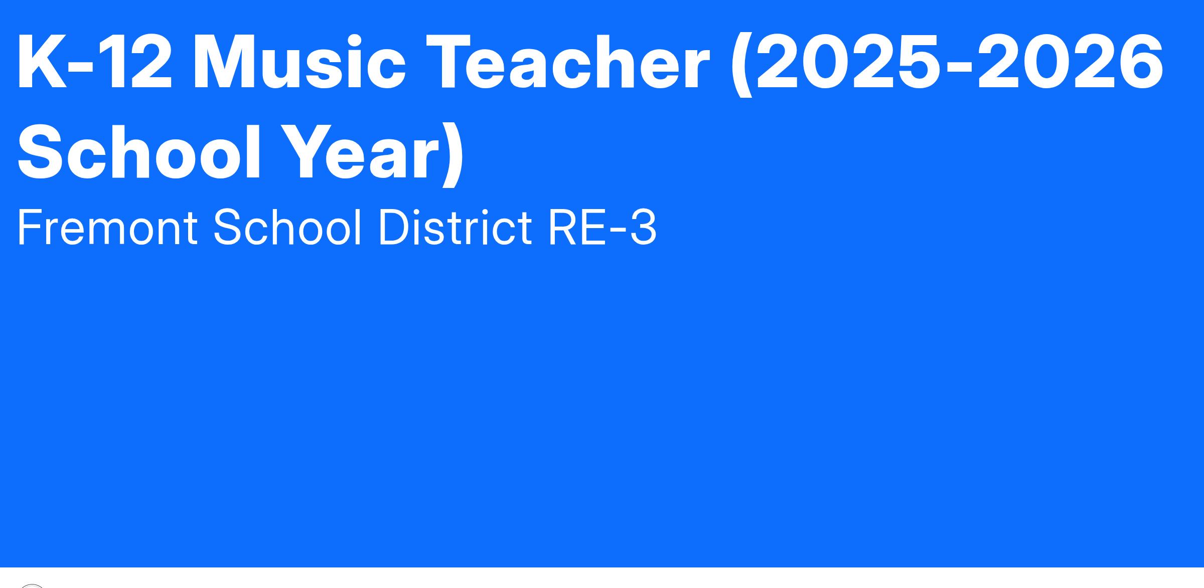 Cotopaxi Schools, located in School District Fremont RE-3, is currently seeking a K-12 Music Teacher. This is a full-time position.